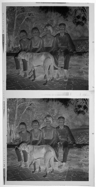 Curator: This photograph, simply titled "Untitled (two zebras at zoo)," was captured by Jack Gould. It's a small gelatin silver print, about 6 by 19 centimeters. Editor: It feels like a study in contrasts. The zebras' stripes against the stark, wire fence and the solid, looming rock in the background. Curator: Indeed! The black and white format emphasizes that duality. Zebras themselves are powerful symbols of balance, of opposing forces coexisting. Editor: And that fence, though physically present, feels almost invisible. The zebras, despite being contained, possess a kind of serene autonomy. The wildness contained, perhaps. Curator: The image invites reflection on freedom, confinement, and the blurred lines between nature and imposed order. Editor: I find myself contemplating what it means to be both exotic and ordinary, a wild creature viewed through the lens of the everyday zoo visit. Curator: It's a simple image that somehow manages to contain complex ideas. Editor: Agreed. And that’s the magic of Gould’s capture; he transforms the mundane into something meaningfully evocative.
