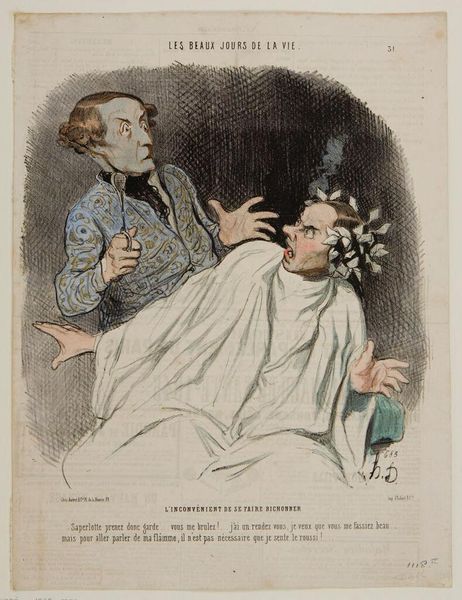 Curator: Here we have "The Hypnotic Diamond" by Honoré Daumier, a black and white lithograph, currently residing at the Harvard Art Museums. Editor: Oh, this feels like a jab at the ridiculous fads of the time! The lines are so sharp, almost cruel, and the faces…pure caricature. Curator: Precisely! Daumier was a master satirist. The diamond, presumably fake, becomes this symbol of societal gullibility. Notice how the woman's eyes are comically crossed? Editor: It’s as if Daumier is saying people will believe anything if it’s presented with enough…theatrical flair. The mesmerizer’s smug expression is everything. It’s a window into the anxieties of his day. Curator: It's an exaggeration, certainly, but truth often lies within such distortions. Think about the ways we still fall prey to illusions, to the allure of quick fixes. Editor: Absolutely, Daumier reminds us not to be too serious, to laugh at ourselves, to question the magic tricks of modern life.
