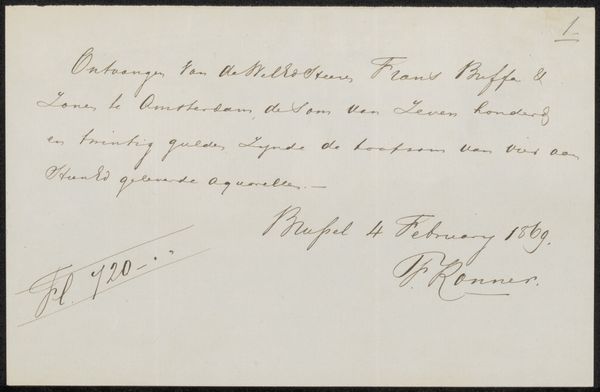 Editor: This is "Ontvangstbewijs aan Petrus Johannes Arendzen," likely from 1886, created by Frans Buffa en Zonen. It appears to be a receipt, rendered in pen and ink. It's intriguing to see typography treated as an art form; what do you see in this piece that I might be missing? Curator: Well, considered from a historian's perspective, the value here lies in the social and economic context it reveals. This isn’t just about aesthetics. It's a document related to art dealing and the art market of the late 19th century. The receipt acknowledges payment for a "drawing plate Rembrandt," indicating an active trade in older master prints. How do you think the art market influenced artistic production at the time? Editor: That's a fascinating point! It makes me wonder how many similar transactions happened and if they impacted the creation of new artworks by contemporary artists, possibly driving them to emulate the style of renowned masters. Curator: Precisely! The reference to Rembrandt connects this transaction to a broader narrative of artistic legacy and the commodification of art history. These kinds of receipts helped solidify artistic value, right? Editor: It definitely makes the transaction tangible. The calligraphy adds an almost performative element. A functional object with style. It gives a glimpse into the social circles that existed then. I learned a lot; thanks! Curator: Indeed, examining even the most seemingly mundane artifacts can unlock rich insights into the past. This transaction reveals not only economic exchange but also the social and cultural values attached to art at the time. It's a small piece of a larger puzzle.