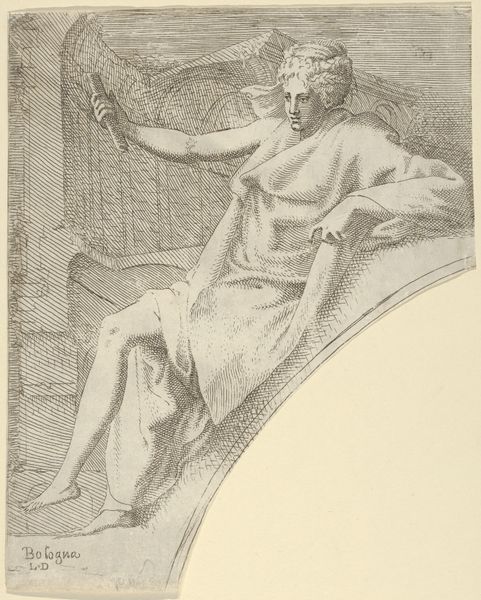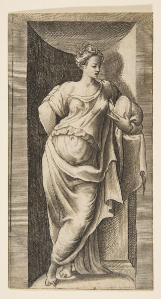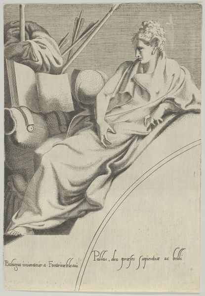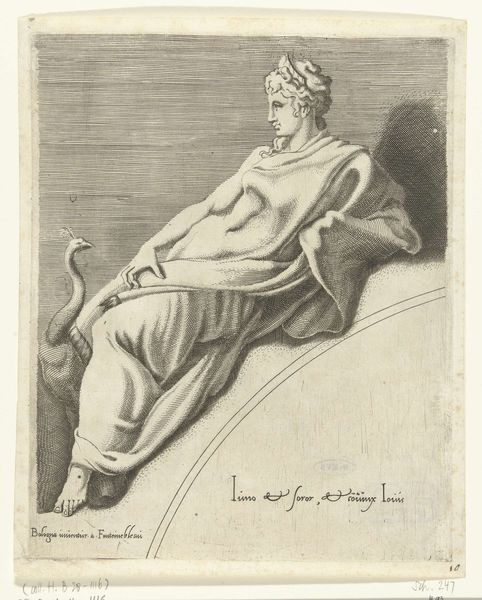 Léon Davent created this engraving of Juno, from "Twelve Muses and Goddesses", around 1550. The composition is dominated by the figure of Juno, seated regally upon a cloud-like throne, her form rendered through a delicate network of fine lines. This lends a tactile quality to the print, despite its monochrome palette. Davent masterfully employs the technique of hatching to define the contours of Juno’s body, creating a sense of volume and depth. The cloud on which she sits is formed through dense, swirling lines, contrasting with the smoother rendering of her draped garments. A semiotic reading reveals Juno’s attributes: the crown, symbol of her queenly status, and the peacock, her emblematic animal, which enhance her status. The print’s formal structure creates a visual tension, with the goddess’s serene pose juxtaposed against the dynamic interplay of lines and textures, inviting reflection on power, beauty and representation.