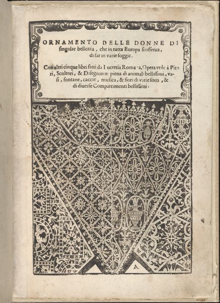 Here is the audio guide script: This is a page from Cesare Vecellio's book, "Corona delle nobili et virtuose donne," an intricate woodcut showcasing lace patterns from around 1591. The composition immediately draws you in with its complex geometric structure. A triangular grid, densely packed with small circles and squares, creates a mesmerizing visual texture. Within each cell, miniature scenes of hunting unfold, depicting figures with dogs chasing hares and stags. The stark contrast between the black ink and the cream-colored paper amplifies the dynamism of these tiny narratives. Vecellio’s use of pattern and repetition hints at the broader cultural interest in ornament and design during the Renaissance, when artists aimed to capture the era’s fascination with detail, decoration, and the natural world within structured forms. The geometric framework does more than simply contain the imagery; it transforms the act of hunting into a decorative motif, raising questions about the relationship between nature, culture, and artistic representation. Consider how the grid itself, a symbol of order, interacts with the freedom of the hunt. Is it a celebration of control over nature, or a subtle commentary on the constraints of courtly life?