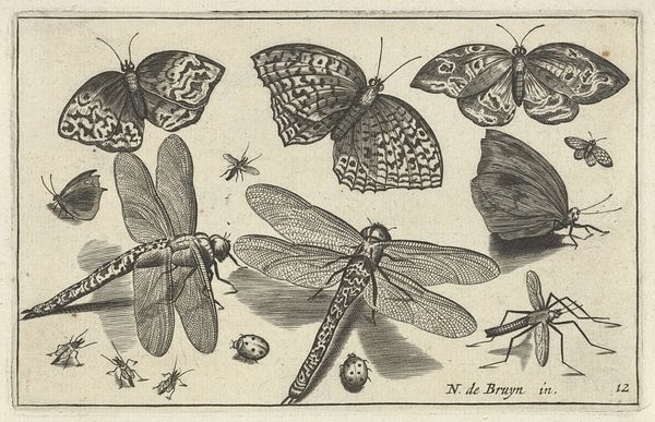 Curator: Up next, we have "Butterflies and Dragonflies," created in 1594 by Nicolaes de Bruyn. It’s an engraving, a type of print, and is part of the Rijksmuseum collection. Editor: My immediate impression is one of scientific curiosity, even meticulousness. It reminds me of early naturalists carefully documenting their observations. The fine lines of the engraving capture delicate wing patterns, but I find it almost clinical, detached from any real sense of life. Curator: Exactly. Consider the symbolism—insects often represented the soul's journey or even the transience of life in that period. Butterflies, especially, were potent symbols of transformation and resurrection, moving from earthbound caterpillar to free-flying beauty. But also think about the rising merchant class at the time, and the rise of science and nascent approaches to a classification of the world. Editor: So the engraving operates on several levels. There’s a spiritual or philosophical undercurrent reflecting on the soul's evolution and the temporary nature of earthly existence. It reminds one that natural science was rapidly being defined and formalized at the same period. Who exactly was the audience? Curator: Certainly, wealthy merchants and burgeoning scientists were a likely market. They might have collected such prints as symbols of status and of burgeoning intellectual prowess. The insects, presented so meticulously, suggest both careful observation and perhaps a desire to categorize and understand the natural world, in terms of art history also marking a transition from the religious paintings to scientific study. Editor: I agree, but let’s not overlook how this feeds into a broader cultural understanding. The Dutch Golden Age was on the horizon, a period marked by intense trade, scientific advancement, and, naturally, colonization. Collecting and classifying specimens, as seen in this engraving, was an active form of establishing mastery, placing European culture at the peak of awareness, influencing how these delicate creatures would later be viewed by an expansionist world. Curator: An excellent point! Seeing them this way gives added context. Now that you mentioned expansion, it would seem to mirror our own. I think I’ll observe and catalog all I’ve learned today too. Editor: And I'm off to rewrite my cultural theories. There’s no lack of reinterpreting that is needed on these older works, always!