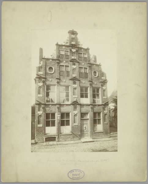 Curator: Well, here we have "Facade van een huis te Enkhuizen", a photographic print capturing a building, dated somewhere between 1870 and 1900. Editor: The immediate impression is one of striking, albeit somewhat subdued, geometry. The facade is so deliberately constructed with its horizontal stripes, yet the monochrome photography washes out some of the impact. I wonder about the kind of labor and materials it took to construct. Curator: It is important to look at the studio of De Vries & Huijsen Jr. located in Hoorn, because these photographs served a public function in representing the burgeoning Dutch national identity and documenting urban development. Editor: Right. This facade. It screams bourgeoisie respectability. But thinking about materiality – the bricks, the timber, the glass… where were those sourced? Were local artisans involved, or were the processes industrialized at this point? The photograph itself is part of a chain of industrial practices. Curator: We have to consider how urban planning in the late 19th century played a crucial role in establishing particular architectural styles. This print isn't just documenting a building, it's reinforcing certain visual ideas about Dutch cultural values to the general public through consumerism. Editor: Yes! I wonder if we can uncover something about how building practices reinforced certain economic or social classes. Were such grand façades commonplace, or were they statements of particular privilege or aspiration in Enkhuizen? Curator: And further, photographic prints like this were frequently acquired, exhibited and collected and functioned in constructing not only the sitter's but also the photographers studio's identity within local, national and at times international circles of visual culture. Editor: The surface details are what captivate, don't they? What materials were valued enough to be displayed so openly, and by which labor? Curator: It's a seemingly simple photograph of a building that really shows us much about societal values and class constructions through public consumption. Editor: Definitely, now I'm considering the labor embedded not only in the building’s construction but the photograph as an item available to the public.