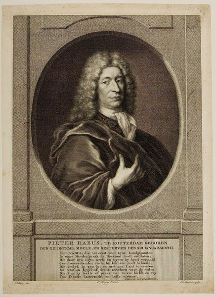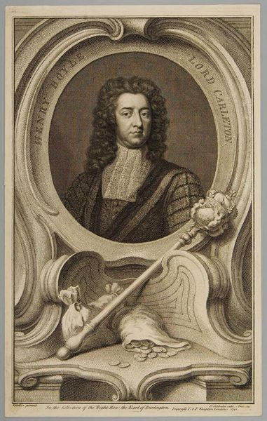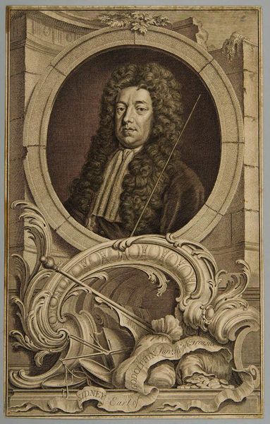 Editor: So, this is a portrait of Philip Jacob Scheurl by Christoph Weigel. It's hard to pinpoint an exact date, but Weigel was active in the late 17th and early 18th centuries. The detail in the engraving is incredible, but what strikes me most is the weight of history—the sitter seems so self-assured. What do you make of this piece? Curator: Well, he certainly wouldn't pop at a party in our era, would he? But that's the beauty of looking back, isn't it? This isn’t just a portrait; it’s a statement. The ornate frame, the cascading wig—they're all designed to project power and status. It’s a carefully constructed image, almost theatrical, wouldn't you agree? Editor: Definitely theatrical! So, more about conveying an image than capturing a likeness, then? Curator: Precisely! It's less about showing you the man and more about showing you *the idea* of the man. It’s like a Baroque-era Instagram filter – all about crafting the perfect image. Editor: I never thought of it that way. It’s funny how much changes, but the impulse to curate an image remains. Curator: Exactly. And that's why these old portraits still speak to us, even now.