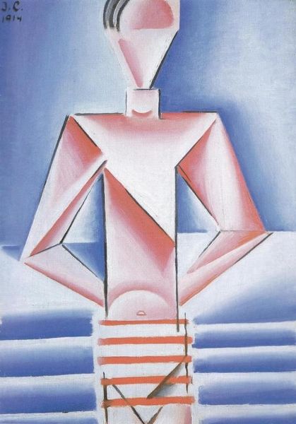 Josef Capek created this painting, "Prodavač kohoutků," likely in Czechoslovakia during the interwar period. The artwork presents us with a figure rendered in a cubist style, holding a small, bright red rooster. Capek was a member of the avant-garde, responding to a new world with new forms of art. The cubist aesthetic reflected the fractured experience of modern life and the painting serves as a social commentary on the everyday worker. The stark geometric forms and muted colors, set against the vibrant rooster, highlight the contrast between the mundane existence of the seller and the vibrant life he offers. To understand Capek’s work fully, we might research the cultural and economic conditions of Czechoslovakia at the time, looking at how artists responded to increasing industrialization, social stratification, and the rise of political extremism. Through historical context, the painting becomes more than just an image; it's a window into a specific time and place.
