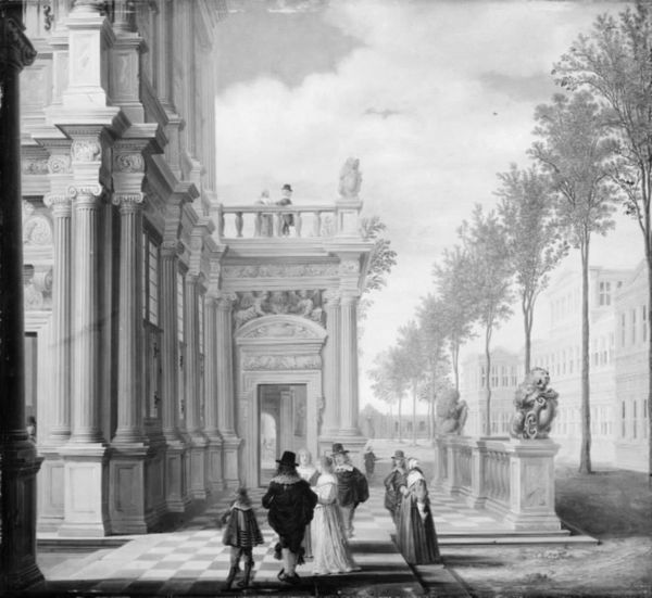Dirck van Delen created "Company at a Palace," using oil on canvas, during a period when the Dutch Republic was flourishing commercially. His architectural paintings are characterized by a precision that reflected the era’s focus on order and prosperity. While van Delen's paintings appear to simply represent places, they also reflect a society deeply structured by class and gender. The palace setting is occupied by a group of figures who are segregated by social standing and gender. Men and women are separated into distinct groups; their placement and posture indicating prescribed roles and limited mobility. The architecture in the artwork does not just serve as a backdrop, but rather as a structural element that reinforces social hierarchies. Van Delen’s work invites us to consider the ways spaces can reflect and perpetuate power dynamics. The painting reminds us that the aesthetics of an era are often intertwined with its social realities, capturing not just what was seen, but also who held the power to see and be seen.