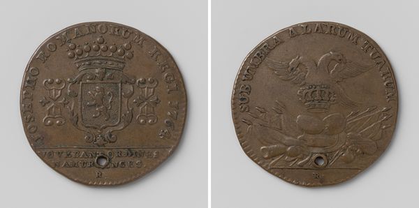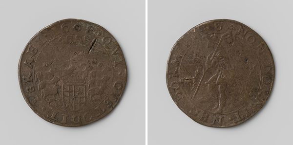 Curator: Oh, I feel like I've just unearthed a tiny treasure, almost! This is a historical medal, "Mislukte vredesonderhandelingen te Keulen," or "Failed Peace Negotiations in Cologne," dating back to 1579. Gerard van Bylaer created it, likely in metal, perhaps as a print or engraving given its detailing. Editor: It feels dense. Heavy, not just in material, but with meaning. So much information crammed into such a small space, like a miniature political drama frozen in time. The monochrome doesn't help; it lends a solemn, almost mournful air to the piece. Curator: Exactly! It’s dense with symbolism. The lion, of course, is a common motif—strength, courage. Here, though, it seems weighed down. See how it’s seated beside what appears to be a broken column, representing that failed peace? I can imagine van Bylaer wanted to create a tangible object reflecting this important political moment. Editor: The lion *is* interesting in this context, isn't it? Not roaring or regal, but almost…defeated. It brings up interesting questions of power, not just of states, but also its limitations, the burden it places. The failure of peace isn't just a political event; it's a commentary on the weight of leadership itself, what happens when diplomacy crumbles? Curator: And that is highlighted, I believe, by that inscription going around the image. Its the inscription with those slightly rough edges… they are a perfect visual analogy for the crumbling agreement, its a really subtle touch from van Bylaer, or not? Editor: It also brings to mind, for me, the endless cycle of conflict and negotiation that defines much of our history. It is a tiny snapshot of a single moment, but I wonder what echoes from the event resonate down the centuries? Was the artist attempting to prevent future similar issues? Curator: It really makes you consider how fragile peace really is. I think van Bylaer definitely succeeds in imbuing the metal with a sense of weight and urgency that transcends the centuries. Editor: Definitely. A tiny metal testament to big failures. It’s a reminder that even the grandest political aspirations can come crashing down. Curator: A small, reflective memento—I'll take that lesson with me! Editor: And hopefully carry it forward towards the forging of future dialogues!