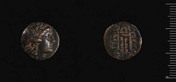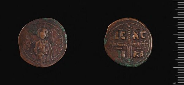 Curator: This is an Anonymous Follis, a fascinating coin, part of the Harvard Art Museums collection. The anonymity itself speaks volumes. Editor: It feels weighty, literally and figuratively. The worn texture and dark patina suggest a history of exchange, of countless hands. Curator: Absolutely. These coins served as a visual language, shaping societal norms, power dynamics, and religious beliefs. The imagery, though simple, reinforces Christian iconography and imperial authority. Editor: Note the cross—a dominant symbol—and the stylized figures that likely represent imperial rulers. Consider how it was used as propaganda, a subtle everyday reinforcement of ideology. Curator: It’s a powerful reflection on the intersection of economics, belief systems, and imperial control. Editor: Truly, a humble object that echoes through the ages.