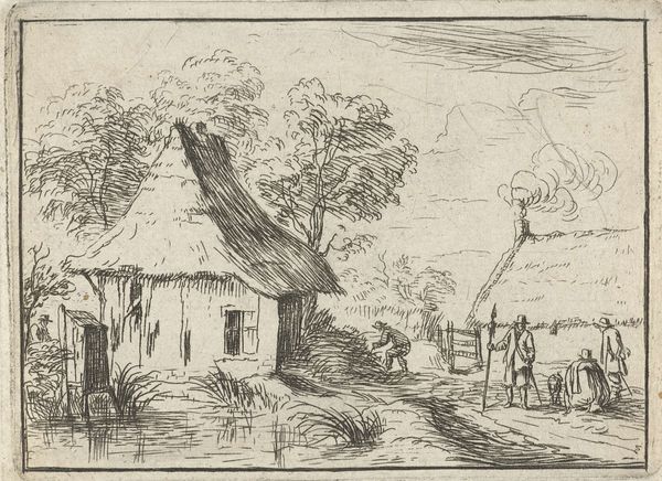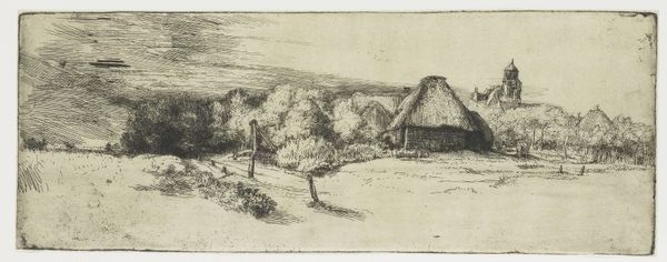 Carel Lodewijk Hansen made this print of a shepherd by a sheepfold using etching, a printmaking technique, sometime in the late 18th or early 19th century. The etched lines create a sense of light and shadow, defining the forms of the rural scene. Note how the thatched roof of the sheepfold seems almost like a rough sculpture, a contrast to the precision of the etching. The process involves covering a metal plate with a waxy, acid-resistant substance, then drawing an image into the wax with a sharp needle. The plate is then immersed in acid, which bites into the metal where the wax has been removed, creating incised lines that hold ink. Hansen likely drew inspiration from the Dutch countryside and its agricultural traditions, engaging with a long history of landscape and genre painting. By focusing on the lives of ordinary people and their connection to the land, artists like Hansen elevated the everyday into a subject worthy of artistic attention. The print provides insight into the social and economic realities of the time, when labor was intimately tied to the land. It reminds us that even seemingly simple images can carry profound cultural significance.