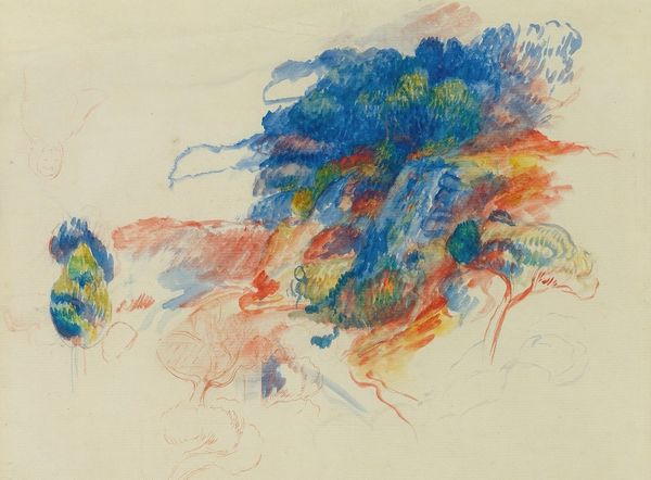 Rik Wouters made this watercolor titled "Roofs, Trees and a Woman" by using a light wash of color to suggest forms and textures. The piece offers a delicate balance between representation and abstraction, evoking a dreamlike quality. Wouters approaches the landscape with a distinctive lightness, dissolving solid forms into loose aggregations of colour. The eye is drawn to the interplay between the black ink used to depict the woman on the left, and the watercolor washes defining the rest of the composition. The contrast destabilizes traditional notions of figure and ground, inviting us to question the relationship between subject and environment. The strategic arrangement of colours and shapes throughout the piece offers a network of signs suggesting form, rather than explicitly defining it. The enduring appeal of this watercolor lies in its ability to challenge fixed meanings and inspire new ways of perceiving the world through the language of abstract forms.