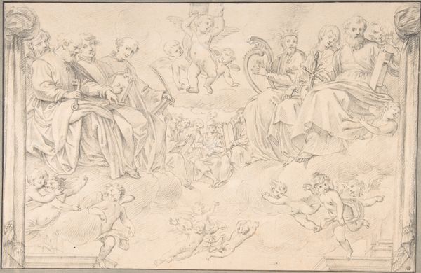 Editor: Here we have an anonymous drawing, "Christ and Mary Interceding with God the Father," created around 1485 using ink. It’s incredibly detailed. What strikes me is the layering and text integrated into the artwork; how do you interpret this work? Curator: Well, considering its materiality, the choice of ink and the linear style point to the readily available materials of the period, primarily driven by scriptoria practices, while also emphasizing the economic context influencing artistic production. It is also a good exercise to think about consumption. What were the conditions and locations for such drawings to circulate at that time? Editor: That's interesting! I hadn't considered how much the availability of materials influenced the artist's choices. So, are you saying the drawing medium directly informed the artwork's style? Curator: Absolutely. And more than style. The use of ink signifies more than artistic choice; it signifies access, skills, workshops... Considering the context of the piece and that it could be a preliminary drawing to a much more elaborated and expensive artistic artifact or a study for other productions of similar iconography. The nature of its production reflects its role. Editor: So, examining the drawing's production allows us to consider its position in a broader network of artisanal practices? Curator: Precisely. The drawing speaks to the society that generated both the materials and the need for it. The integration of text emphasizes literacy, and the figuration echoes prevalent spiritual beliefs of that same society, all tied to labor conditions that make creation possible. Editor: It’s like uncovering a social history etched in ink. This focus has illuminated so many social layers of the artwork. Thanks! Curator: My pleasure. Understanding the materials and the means of their production reveals so much more than aesthetic qualities.