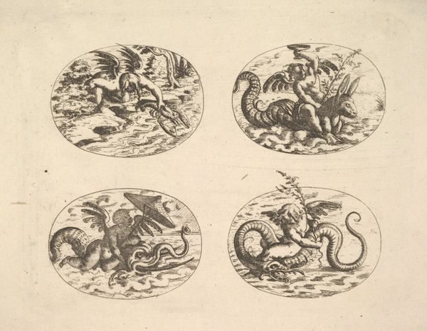 Curator: Here we have "Four Ovals with Genii, plates from the Neue Grotessken Buch," an engraving by Christoph Jamnitzer, dating back to 1610. It's currently held at the Metropolitan Museum of Art. Editor: Immediately, I'm struck by the whimsical, almost unsettling quality of the composition. There’s something so meticulously rendered yet deeply strange about these cherubic figures riding bizarre sea creatures. Curator: It’s a potent example of Mannerism, reflecting a fascination with elaborate ornamentation and esoteric symbolism. The "Grotesken Buch," or Grotesque Book, was a popular genre showcasing fantastical designs used by artisans and craftsmen. Consider the social function: the work wasn't intended to be just decorative. Editor: Right, these weren't autonomous artworks in our modern sense but pattern templates for application in other areas? I notice how each oval is self-contained with rhythmic line work, echoing classic idealized forms in novel, slightly off-kilter ways. There is also a real push and pull between decorative exuberance and allegorical weight. Curator: Precisely. While seemingly lighthearted, each vignette operates on multiple levels. The figures, which can read as cherubs, actually take cues from classical genii—spirits embodying protection, guidance, or specific attributes tied to one's personhood. This visual language reinforces early modern European cultural values. Editor: I agree; there is an inherent contradiction. The engraving offers itself up for practical purposes, yet the density and detail compel you to contemplate symbolic weight, specifically themes of transition. It gives the viewer a lot to digest in its strange visual grammar. Curator: Exactly. And seeing them now, we can understand the broader social role this print and others of its type may have performed, reinforcing period aesthetics while transmitting very particular political and social messaging that would be widely disseminated through craft and applied arts. Editor: Looking at these designs from a formalist perspective helps decode Jamnitzer's ability to render dreamlike invention with masterful technical skill, creating intriguing variations. Curator: Understanding the plates in their historical and cultural context reveals much about identity formation and ideological dissemination in early modern Europe.