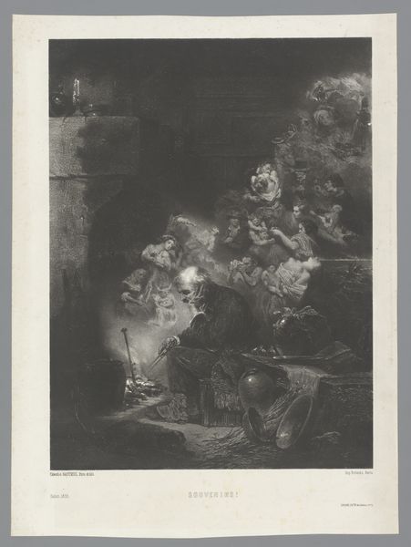 This drawing, by Albert Robida, presents a man surrounded by characters from novels, realized with graphite on paper. Look closely, and you’ll notice the artist's hand in the graphic quality of the lines, creating a sense of depth and movement that invites us into the reader's imaginative space. The method of production—drawing, a traditional and versatile medium—lends itself to the depiction of interiority and the blurring of reality and fiction. The choice of graphite, with its capacity for subtle gradations and textures, allows Robida to create a dream-like atmosphere, echoing the immersive experience of reading. The work reflects a culture increasingly shaped by mass media and the commodification of leisure. Yet, it also celebrates the enduring power of the imagination, reminding us that even in an age of mass production, individual experience remains vital. This piece encourages us to reconsider the value of materials, making, and context in understanding art's significance.