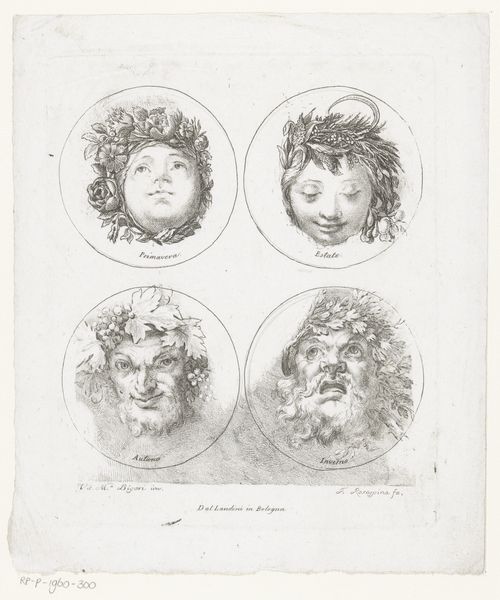 Michael Wachsmuth created this print, "Vier portretten van kunstenaar Rafaël," presenting four imagined portraits of the artist Raphael. The portraits, all of a similar androgynous figure, share soft features and long flowing hair. The figures are numbered and presented in oval frames, their faces angled to provide a dynamic perspective. The figure in the lower right is notably distinct, their shoulders are shown and they seem to be wearing a lace collar. The figures appear both masculine and feminine, blurring the lines of gender identity. Prints like this one circulated widely, shaping perceptions and constructing narratives around notable figures like Raphael. Wachsmuth engages in the construction of Raphael’s identity, inviting viewers to consider the multifaceted nature of artistic persona. The emotional depth of this print lies in its ability to both celebrate and question the nature of identity.