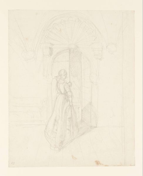 Curator: Looking at William Blake’s "Preliminary Sketch for ‘Christ Girding Himself with Strength’" I feel an incredible sense of vulnerability. It’s so raw. Editor: Yes, there is an unfinished quality that highlights Blake's process; it reveals the labor behind his visionary output and that the image, though faint, is rendered on paper measuring approximately 50 by 42 centimeters. Curator: It's more than just a sketch; it feels like a glimpse into the very moment of creation. Those delicate lines hinting at Christ's form... I sense a deep yearning. Editor: And how fascinating that this tender rendering of Christ is, in fact, a preliminary study, suggesting a constant process of revision and refinement, driven by material and social pressures. Curator: Perhaps. For me, though, the sketch breathes with an almost ethereal quality, transcending the mundane. It asks us to consider the human and the divine intertwined. Editor: A connection no doubt facilitated by Blake’s own labor and, of course, the specific materiality of graphite on paper. We are left to wonder about Blake’s intentions, but I’m left thinking about the conditions that enabled it. Curator: Ultimately, both the seen and unseen aspects of Blake’s vision elevate it to something truly extraordinary. Editor: An output of the extraordinary effort and material realities that underpin all artistic creation.