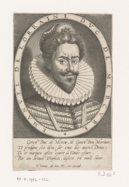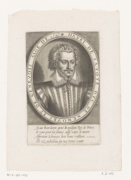 This is Pierre Faber's portrait of Louis XIII of France. This print leverages the circular form to direct our focus to the king's face, framed by an oval border inscribed with Latin text. The overall effect is one of classical formality, typical of royal portraiture. The composition reveals a structured hierarchy: the king's image is centered and elevated, literally inscribed within a frame of text that lauds his virtues. This evokes the semiotic understanding that portraits are not merely representations but also symbolic constructs designed to convey power and legitimacy. The meticulous detail in Faber's rendering, from the lace collar to the textured hair, suggests an effort to capture not just likeness but also status. The lines and shapes create a visual language of power, carefully constructed to reinforce the king's image. Ultimately, this portrait should be seen as an exercise in controlled representation, where every element is carefully arranged to communicate the subject's authority.