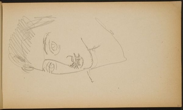 Curator: Here we have Kenyon Cox's "Caricature of John Singer Sargent," dating to around 1882, held at the Harvard Art Museums. Editor: Oh, it's quite brutal! The lines are so sparse, almost aggressively simplified. It gives Sargent a rather austere, even humorless air. Curator: It's a fascinating piece of social commentary, really. Cox and Sargent were contemporaries, both navigating the art world of the late 19th century. This caricature, inscribed "avec les compliments de l'auteur," suggests a complex relationship—perhaps admiration tinged with rivalry? Editor: The formal reduction is striking. Note how the essential features – the nose, the mustache – are rendered with just a few strokes. It's a study in economical representation. Curator: Precisely. Caricatures, in their exaggerated forms, often reflect societal perceptions. Consider the image of the artist as a refined gentleman that Sargent cultivated. Cox seems to be deflating that image, revealing, or perhaps constructing, a different kind of artistic persona. Editor: Ultimately, it is just an honest depiction that captures a personality with minimal detail. Curator: It speaks volumes about artistic circles and their unspoken dynamics.