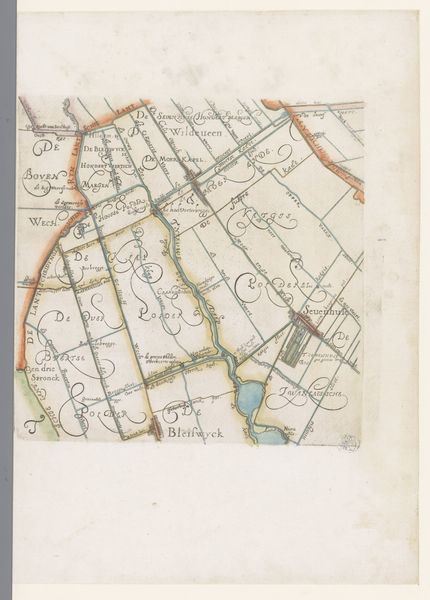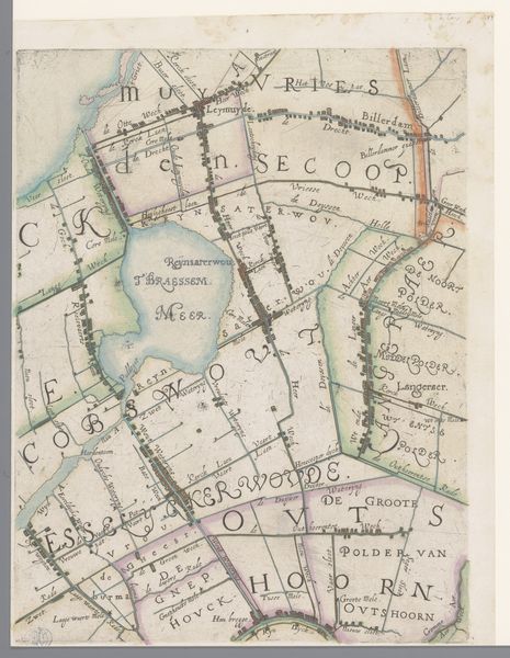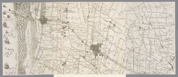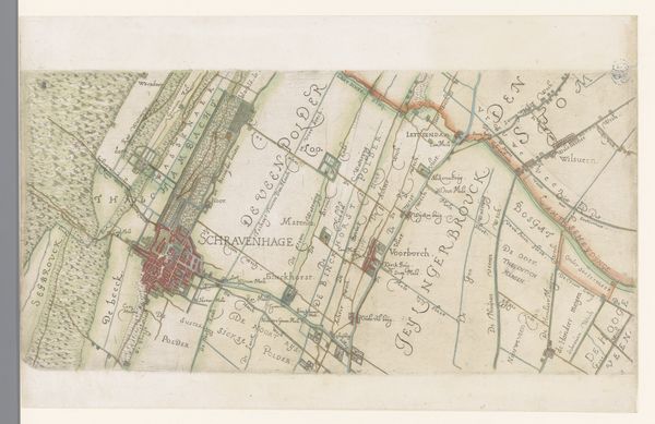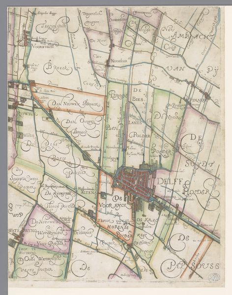 Curator: Look at this intriguing drawing. It’s a portion of "Kaart van het Hoogheemraadschap van Delfland, met Zevenhuizen en Bleiswijk," a map of the Delfland region created between 1611 and 1692, by Floris Balthasarsz van Berckenrode. Editor: It’s quite striking how geometric the landscape appears. So much imposed order. Almost feels…clinical, even. Curator: Maps like these weren't just about geographical accuracy; they represented power structures. Consider the meticulous labor involved in surveying and drafting, skills primarily accessed by privileged members of Dutch society. This level of detail signifies control over land and resources. Editor: Absolutely. The very act of mapping is an act of claiming, organizing the natural world to reflect human needs. We should think about the social context – land ownership, water management – and who benefited from these mapped-out divisions during that time period. These neat divisions hide the intense contestations and power dynamics inherent in controlling water resources, a particularly crucial issue in the Low Countries. Curator: The choice of ink and paper also informs our understanding. These materials speak to the availability and cost of documentation at the time. And the artistic flourishes of the script elevate the document beyond a mere functional diagram. This isn't just cartography; it’s craftsmanship. Editor: Precisely. The elegant script you mentioned isn’t simply decorative, it also signifies a certain level of literacy and education, pointing to the socioeconomic status of those who produced and consumed this kind of visual material. Curator: The map gives a detailed snapshot into the water management systems and engineering marvels achieved in that area. Canals, locks…all testament to their ability to shape the environment. Editor: Right, and how that impacts notions of space, access, and community is still worth questioning now. Maps aren't neutral documents; they can uphold certain values and make some histories far more visible than others. Curator: I'll certainly view this artwork with a more questioning eye moving forward. Editor: Me too. Examining this map has underscored just how deeply art is intertwined with historical and social power.