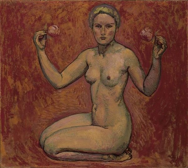 Curator: Let’s take a look at Cuno Amiet’s, "Female Nude with Flowers (The Truth)," painted in 1913, executed with oil paint, featuring impasto in some areas. What do you make of it? Editor: The warmth almost radiates, doesn’t it? It's a bit unsettling but comforting, all those layered peachy hues wrapping this figure. Like she’s emerging from a dream or being formed from earth itself. Curator: The materials really play into that earthy feel, I think. Amiet’s use of oil, especially the impasto texture, speaks to the physical labor and materiality behind image-making. It’s not just an idealized nude; there’s a rawness. Editor: Exactly! And there’s a beautiful dissonance between the overt, almost Symbolist presentation—that "truth" hinted at in the title—and the unidealized form. It makes me question those classical depictions and how often they erased lived experiences of real bodies. Curator: The very fact that the model holds flowers is fascinating when contextualized within the turn of the century, right before World War One and the avant-garde embrace of machinery, urbanization, and mass production. What's your read on this seemingly intimate offering of flora? Editor: It feels incredibly deliberate, right? Flowers signify purity, often, or sensuality. But here, they’re held as…evidence, perhaps? Proof of a tangible, unadulterated beauty against the backdrop of, as you mentioned, impending mechanization and dehumanization of industrial conflict. Almost like holding onto the last threads of Eden. Curator: And how fascinating to create a figure seemingly from one flesh-like plane to then fragment with light and color and create texture, so she emerges both singular and multi-dimensional. Editor: The work's title challenges us too, perhaps to discover or rediscover that essence, the very heart of human form represented through those very particular flowers and palette. It’s as if he's stripping away pretense and demanding we acknowledge this is what it really looks like—the "truth", as the title claims. Curator: It makes you ponder artmaking as a site of personal, political, and ultimately deeply humane reckoning. Editor: Definitely a poignant piece. Amiet has carved out a compelling dialogue on embodiment and the quest for meaning in turbulent times. I could spend a lot more time in front of this painting!