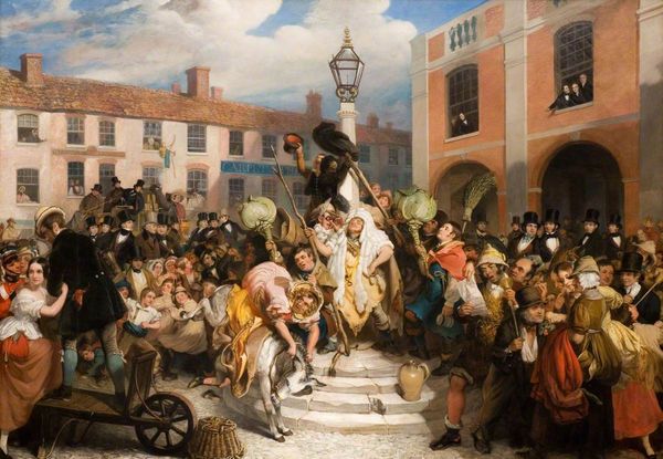 Editor: Wilhelm Marstrand's 1839 oil painting, "Romans Gathered for Merriment at an Osteria," really captures a lively energy. There’s such a sense of community and joyous celebration. How do you interpret the scene’s symbolism, and what might the choice of this specific setting communicate to its viewers? Curator: The Osteria, a simple tavern, becomes a stage. Notice how Marstrand orchestrates the scene. The dancers are foregrounded, framed by a portal offering glimpses of the city, and beneath a religious icon—a layering of sacred and secular space. This wasn’t just merriment, it’s a deliberate representation of Roman identity, almost a Romantic’s yearning for a vibrant past. Do you see how the colors enhance this? Editor: I do. The bright clothing contrasts with the weathered architecture. It creates a kind of vibrant nostalgia. The revelry almost feels defiant. Curator: Exactly. Defiant, but also a reaffirmation of cultural roots. Think of the tambourines and lute; they're not just instruments. These objects represent cultural memory, tradition passed down through generations. What story do you think this picture is telling through those symbols? Editor: I’m starting to see how the layers build: a depiction of revelry as a symbol for Roman cultural pride, all staged in a way that connects the past and the present. Curator: And remember, paintings like these reinforce identity – visually embedding cultural continuity into the minds of its viewers. Editor: That's fascinating! I initially just saw a party scene, but now I understand it’s much more, it's an idealized assertion of cultural memory. Curator: Precisely. Images are never neutral, they're cultural containers, packed with meaning. And it's in these layered symbols that we find the artist’s intent.