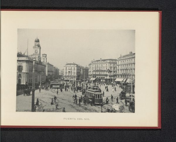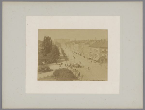Editor: This albumen print, titled "Gezicht op de Karl Johans gate in Christiania" by Knud Knudsen, dates to around 1880-1898. I find the clarity striking for a photograph of this age, it gives such a strong sense of bustling street life. What are your thoughts on this cityscape? Curator: It’s a captivating document. I immediately look at the mode of production itself - the albumen print. Think about the labour involved: creating the emulsion, coating the paper, exposing the image. This wasn't a snapshot; it was a constructed image relying on complex industrial processes. Consider also the subject matter – the Karl Johans gate. It represents the modernizing city and the infrastructure of capital. The horse-drawn trams weren't just transport; they were products of industry, moving both people and, symbolically, commerce. What details stand out to you that might reflect the relationship between materials and society? Editor: The people! They seem carefully posed or perhaps blurred by the exposure time. Their clothing suggests a burgeoning middle class, but are their lives changed for the better by the products and industry visible here? Curator: Precisely! Notice how their attire hints at access to manufactured goods, enabled by the capitalist systems shaping their environment. Also the Grand Hotel in the image is key. It would have consumed vast resources - think of its construction, maintenance, and the provision of luxuries to its patrons. So much of its economic activity rests on consumption! And consider who could afford to engage with this space - its accessibility depended on their economic capital. The photograph therefore functions as both document and also material product circulating within similar socio-economic structures. What's changed about how we consume images of urban spaces today? Editor: I hadn’t considered that. Today, everyone has easy access to such images through digital media, drastically altering production and consumption. Thanks, I am looking at this image in an entirely different light! Curator: Indeed, understanding the materiality helps reveal social structures encoded in this photograph.