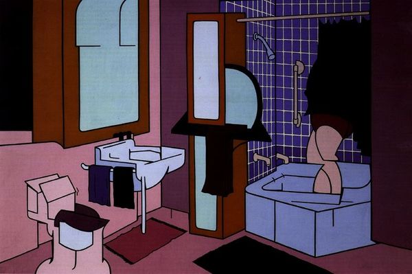 Patrick Caulfield created this striking composition, "Interior: Evening," using bold colors and simplified forms. Immediately, the eye is drawn to the stark contrast between the red rectangles of the windowpanes and the green framework, outlined in black. This use of color and line flattens the image, rejecting traditional perspective in favor of a more graphic, almost poster-like aesthetic. Caulfield's approach reflects a broader trend in Pop Art, where everyday objects and scenes are rendered with a hard-edged clarity that challenges the viewer's perception of reality. Here, the interior scene is stripped down to its essential elements, creating a sense of artificiality and detachment. Consider how the hanging lampshade, rendered in a similar flat green, further contributes to this sense of constructed space. It is through the formal qualities of color, line, and composition that Caulfield engages with questions of representation, inviting us to reconsider how we perceive the spaces we inhabit.