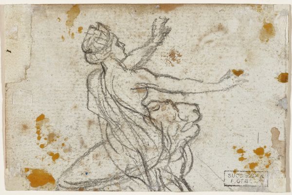 Curator: Paul Konewka sketched this pencil drawing, titled "Titania and Oberon," sometime between 1867 and 1868. It currently resides in the Städel Museum. Editor: My initial impression is that this has an ethereal, fleeting quality. The figures are barely there, more like suggestions of form than fully realized beings. There's something fragile about the entire composition. Curator: Absolutely, the lightness of the pencil strokes contributes to that effect. Konewka was deeply invested in the Romanticism style. Note the dynamic contrapposto of both figures, how they relate to each other yet occupy their own space within the plane of the work, reinforcing this artistic choice. Editor: This drawing feels so caught up in a particularly patriarchal interpretation of Romanticism that it fails to reflect current sensibilities about gender relations and agency. Curator: It can be challenging to reconcile past interpretations with our contemporary worldview. Konewka seemed more preoccupied with capturing the idealized forms, referencing classical statuary. Observe how he outlines the musculature of Oberon’s leg and contrasts this with the drapery surrounding Titania's form to provide balance to their implied movement. Editor: I find that, from an activist position, even the figures are complicit. It seems they’re being swept along on the journey rather than determining their individual or shared directions. I also believe we should acknowledge the inherent bias within institutions. How many drawings of Zeus are featured? Do we examine Zeus through such stringent considerations of compliance? Curator: That's a relevant point. While interpretations change with evolving sensibilities, we can analyze what Konewka conveyed formally. Editor: Still, acknowledging these broader implications is vital. To view the work in isolation denies both its complexity and its socio-historical existence. By acknowledging these complexities we can view both how the artist rendered their interpretation while using the opportunity to educate ourselves about past/present perceptions of these types of subjects. Curator: Well, my hope is that attentive examination enhances our appreciation of the line, structure, and relationship presented in "Titania and Oberon." Editor: And I remain hopeful that an approach with activist insight sparks reflection, furthering progressive evolution both in thought and awareness.