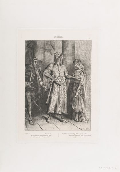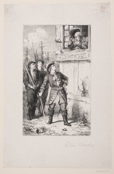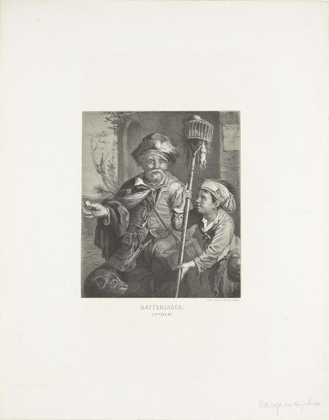 Dirk Jurriaan Sluyter created this print, "The Rat Catcher with his Servant," using etching techniques, rendering a scene dominated by detailed textures and tonal contrasts. The composition focuses on two figures: an older rat catcher and his younger assistant, set against a backdrop that blurs the line between interior and exterior space. The print is an exercise in contrasts. Observe the textures of the clothing, the rough handling of the rat catcher's garments against the smoother skin of his apprentice, creating a dialogue about age and labor. The rat catcher carries a pole topped with what appears to be captured rats, a macabre detail rendered with stark realism. Sluyter uses the medium of etching to explore themes of marginality and the everyday. The meticulous lines construct a world where the grotesque and the mundane coexist, inviting us to question the values we assign to different forms of labor and existence.