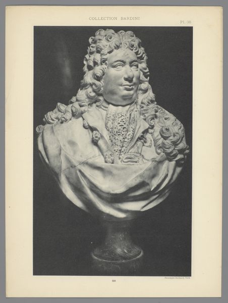 Curator: Here we have a photographic print of an unknown woman's bust, believed to date between 1875 and 1912. The sculpture itself is crafted from marble in a Classical-Realist style. Editor: She exudes such poised stillness. There’s a certain detached elegance in her expression, but also perhaps a sadness hinted at the corner of her mouth. It’s beautifully executed, I am especially drawn to the intricate lace trim of her dress, and how they are contrasted against her firm profile. Curator: Exactly. The photograph's composition reflects a fascination during that period with Neoclassical sculpture and its role in constructing ideas about beauty and societal order. This would likely have circulated among a refined, upper-class audience interested in art collecting and the continuation of classic ideals. Editor: I’m wondering who decided her image should be immortalized? Was this commissioned, or was it her husband’s posthumous commemoration, reflecting the patriarchal conventions in commemorating women within domestic roles? These prints allowed for the democratization of artworks, enabling broader audiences to view masterpieces that otherwise would only have been enjoyed by a select few. But, let’s think critically, what's concealed or distorted in the context of representation and reproduction? Curator: That’s a very important consideration. Reproductions often served didactic purposes, spreading notions of idealized beauty. It also perpetuated narratives that women’s worth was strongly correlated to their appearance, social status, and legacy-making. This classical-realist style contributed to establishing and maintaining such societal structures. Editor: Agreed. Though this lady's identity eludes us, by scrutinizing how she was visualized, promoted, and valued, we unlock layered meaning in how identity, gender, and cultural standards intertwine to determine one’s position in history. Curator: It also brings attention to how images, through reproduction, enter social life, acquiring a life and impact of their own—well beyond the intentions of the original artist or patron. Editor: Anonymity might shroud some identities, but, as we discussed, even so, this visual can trigger thoughts on long lasting cultural, political issues concerning portrayal, and social norms which still resound even to this very day.