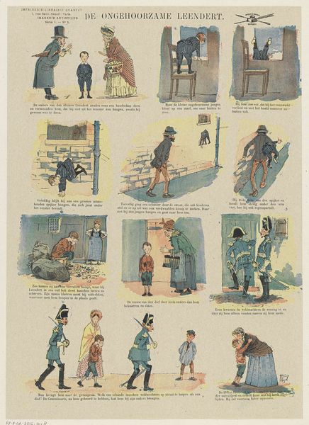 This is "Boertje! zijt gij moê? [(...)]" a children's print made by Albertus Willem Sijthoff in the Netherlands. Although undated, it was likely created in the mid to late 19th century. The print presents a series of small, anecdotal scenes accompanied by short verses in Dutch. Through depictions of everyday life and common archetypes, the print offers a glimpse into the values and social norms of the time. Themes of work, play, and family are presented with a didactic tone, reflecting the era’s emphasis on moral instruction for children. Interestingly, the print also features imagery that reflects the colonial attitudes prevalent in Dutch society at the time, presenting questions about cultural representation and identity. While seemingly innocent, these prints also reveal the complex ways in which power dynamics were embedded in everyday life. How do these seemingly benign images contribute to a broader narrative of cultural superiority and domination? How might we read these images today, in light of postcolonial critique?