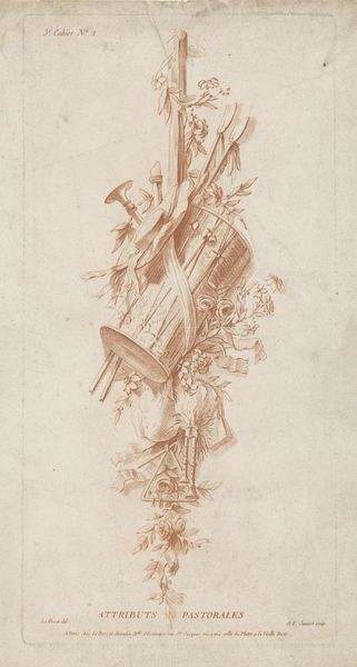 Curator: Welcome to the Rijksmuseum. We are standing before Jean François Janinet's "Tragedie," an engraving and etching rendered between 1772 and 1779. Editor: It's quite striking. My immediate thought is how theatrical it feels, almost like a crest or a meticulously arranged stage prop. The sepia tones give it a feeling of antiquity. Curator: The artist indeed amassed allegorical objects to form a visual representation of tragedy. The arrangement and meticulous etching technique amplify the work’s thematic concerns. Do you notice the strategic juxtaposition of items? Editor: The armor, weapons, and even the musical instruments… they aren't just arranged, they are intertwined. It is visually overwhelming; there is a great deal of stress. It reflects the chaos and ultimate failure found in tragic narratives. How might we contextualize Janinet's approach? Curator: Janinet was working during a time of great social and political change, and the concept of tragedy was being re-examined in light of Enlightenment ideals and the coming French Revolution. Editor: So, is it commentary on the traditional, even romanticized view of tragedy in art? The jumble almost satirizes grand depictions of historical events that dominated Baroque history paintings. It is in complete defiance of French Royal Academy doctrine. Curator: One could argue it suggests the weight of history. But through formalism, you can also see how the artist employs symmetry while embracing organized clutter. The lines and shapes themselves suggest both structure and turmoil. Editor: That makes me see a larger perspective. Thinking historically, one could also suggest that Janinet is commenting on the theater of power itself, reflecting the period when institutions were both celebrated and scrutinized. It could imply impending doom of systems. Curator: Precisely. Art continually adapts the conversation; "Tragedie" functions both within, and as critique of, those historical narratives. Editor: It's a work that really benefits from this close consideration. Curator: Absolutely, an amazing work of material and conceptual depth from Janinet.