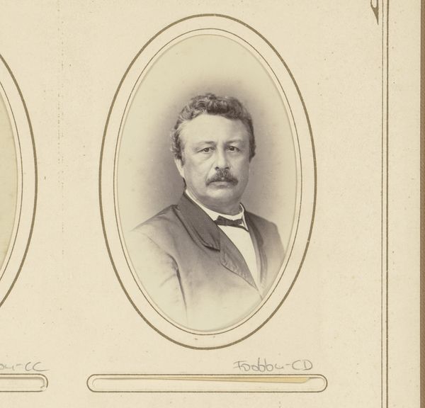 Editor: This gelatin-silver print, titled "Portret van een man met snor en vlinderstrik," dates back to between 1860 and 1900, attributed to B. Obrist. The oval frame gives it a quaint feel, but I'm struck by the direct gaze of the man. How do you read this portrait? Curator: Well, let’s think about the means of its production. A gelatin-silver print indicates a shift from earlier photographic processes, impacting its accessibility. This technology changed who could commission and consume portraiture. Was it for the wealthy, or are we starting to see the democratization of portraiture, making it available to a rising middle class? Editor: That's interesting. I hadn’t considered that access might influence the creation. What's the significance of the man’s clothing and the meticulous nature of his presentation in that respect? Curator: His attire—the bow tie and jacket—speaks to bourgeois respectability, of course. But it is the printing process rendering of these elements that truly engages me. This isn't just about representing wealth, but how that wealth is manufactured and consumed visually. How is the production and distribution of this image intertwined with the burgeoning consumer culture of the late 19th century? Was this, itself, a commodity? Editor: So, it’s less about the man himself and more about how his image functions within the larger economic picture of the time. Curator: Precisely! The materials, the process, and its cultural context all shape our understanding of the portrait. Even the choice of printing materials has economic implications. Editor: I never would have considered the materials used as playing such a pivotal role. Curator: Thinking materially allows us to unearth the underlying labor and commerce shaping this seemingly simple photograph. Editor: That's a fantastic perspective. I'll definitely be more mindful of that in future analyses. Thanks for your insights!