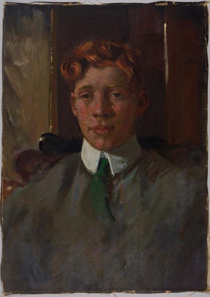 Curator: Here we have Denman Waldo Ross's "Portrait of a Young Man with Black Jacket," currently residing at the Harvard Art Museums. The date is unknown, which opens a lot of possibilities. Editor: There's something very somber about it. The muted palette and the subject's direct gaze create a sense of introspection. I appreciate the artist’s handling of light on the face. Curator: Ross was quite interested in color theory and design. One wonders about his choice to depict this particular subject. Was it a commission, or a study? The lack of details hints at a modern conception of portraiture. Editor: The visible brushstrokes contribute to its raw feeling. There's a certain tension between the loose application of paint and the clarity of the facial features. It’s quite captivating. Curator: Indeed, and the lack of historical context allows us to project our own readings onto the subject. It’s a portrait that begs us to consider the artist’s intentions. Editor: It's a striking piece; the restrained palette invites deeper inspection into the portrait's mood and the artist’s technique.