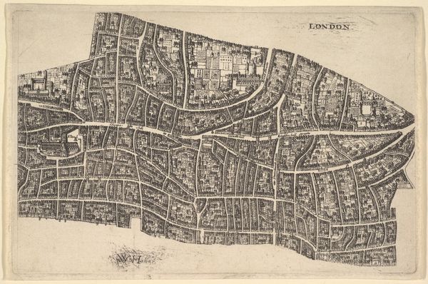Editor: Here we have a section of “Plattegrond van Den Haag,” or “Map of The Hague,” possibly created between 1665 and 1682 by Cornelis Elandts, using ink, engraving, and drawing. It's fascinating to see such a detailed cityscape rendered in pen and ink! What do you see in this piece, beyond just a map? Curator: More than bricks and mortar, isn't it? For me, this is about presence. It’s an entire world meticulously laid out with these fine strokes. I can almost feel the pulse of 17th-century Hague! The people are rendered so small, yet they fill the plazas – can you sense their communal life, their purpose? Are these the faces that would define Dutch identity for generations? I'd say this transcends the mundane. Do you get a sense of pride and maybe aspiration in the level of detail? Editor: I hadn’t thought of it like that. I was focused on the precision of the lines, the bird's-eye perspective. Now I'm seeing a community portrait, I suppose! A very, very granular one. It is incredible, all those tiny people captured with the same level of precision as the architecture. How did an artist achieve that? Curator: Patience, dear student, lots of patience, and a profound sense of connection to the place! Perhaps a touch of romanticising it as well. The crispness elevates something functional, like a blueprint, into an artefact worth cherishing. Did this change the way you initially interpreted the artist’s intentions? Editor: It does, actually! I came in thinking ‘historical document’, now I see it more as a... celebration, even? Thanks, that’s given me a lot to consider! Curator: And for me, it's been lovely revisiting those impressions; reminding me art speaks most strongly when we embrace its spirit, not merely its shape.