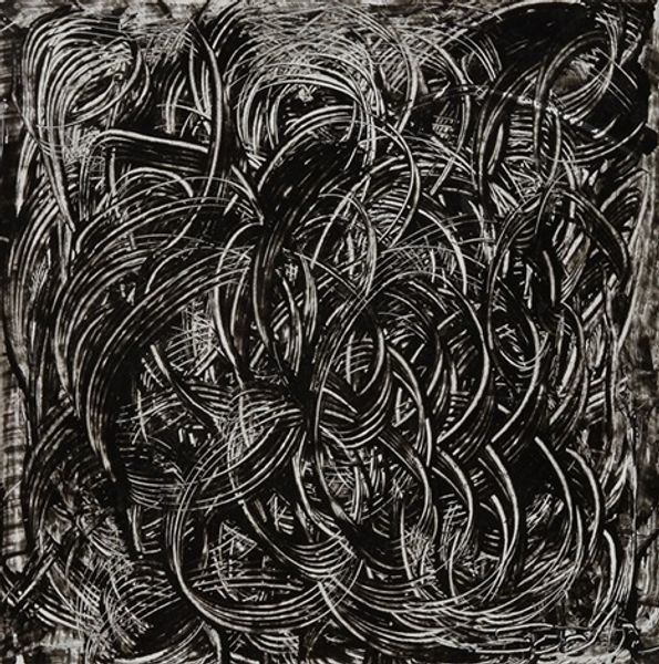 Editor: This is Melissa Meyer's "Arachne" from 1984, created using ink and drawing techniques. I’m immediately struck by how the strong contrasts create a dynamic tension; it feels both chaotic and incredibly controlled. What are your initial observations? Curator: Indeed. The interplay between positive and negative space is quite compelling. Notice how the artist uses swirling lines and dense cross-hatching to construct a central vortex, seemingly pulling everything towards it. Does the composition suggest to you any particular structural arrangement beyond the chaotic appearance? Editor: I see a kind of vertical emphasis, despite the swirling motion. Almost like a… a distorted tree or figure is emerging from the bottom, reaching up toward that vortex? Curator: Precisely. The vertical thrust is undeniable, and note also how Meyer contrasts that with the horizontal banding formed by the implied web-like structure mid-ground. This creates a visual counterpoint, a tension between aspiration and constraint. How does that reading resonate with your understanding of formal qualities such as rhythm? Editor: It adds a layer of complexity I hadn't considered! The repetition of the lines, the varied thickness and direction, do create both rhythm and dissonance, reflecting that tension between reaching and being bound. Curator: Precisely. Meyer skillfully manipulates the formal elements to generate multiple readings. A detailed look also reveals many different line qualities—scribbled, dashed, smooth. How do they contribute to the reading as a whole? Editor: They really enhance the sense of movement, and even the psychological tension. The varying lines definitely underscore that there is not an easy way out of the structure. Thanks! It’s exciting to see how all the artistic elements interact in ways I hadn't grasped. Curator: Indeed. A close study reveals that the artist has meticulously orchestrated a captivating work.