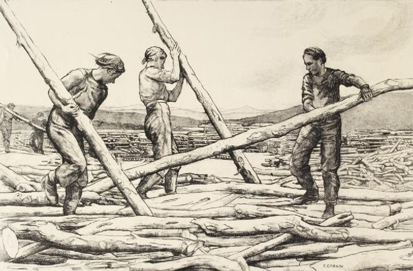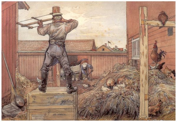 Carl Larsson made this watercolor of woodcutters in a forest, and right away I'm struck by the way he layers the scene with these delicate washes, almost like memories fading into each other. There’s a real sense of looking *through* the image, not just *at* it. The texture is amazing – you can almost feel the rough bark of the logs and the crispness of the snowy air. And look at how the light plays on the wood, creating these subtle shifts in color. It’s like he’s capturing the very essence of winter, the way the cold transforms everything it touches. The paint feels thin and deliberate, allowing the paper to breathe beneath, giving the scene a lightness despite its weighty subject matter. And that one woodcutter with his saw – the way he's bent over, all concentration and effort – it reminds me that art, like labor, is about putting in the work, trusting the process, and finding beauty in the everyday. It echoes Pieter Bruegel somehow, although Larsson certainly brings his own light touch to the subject. Ultimately, it's a scene filled with ambiguity, and I like that.