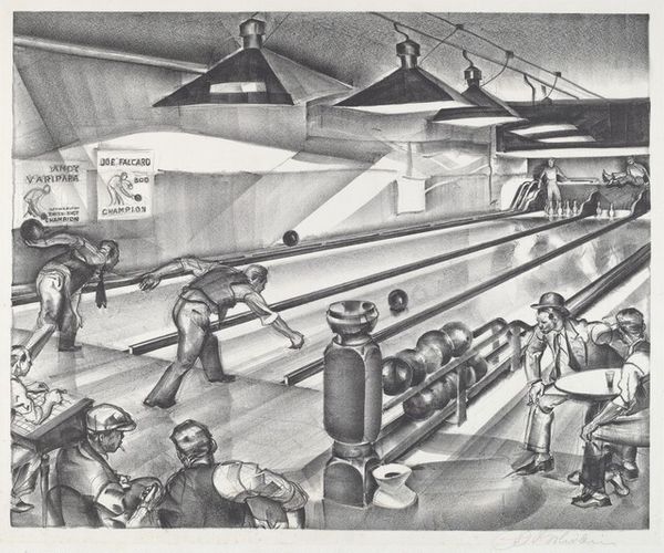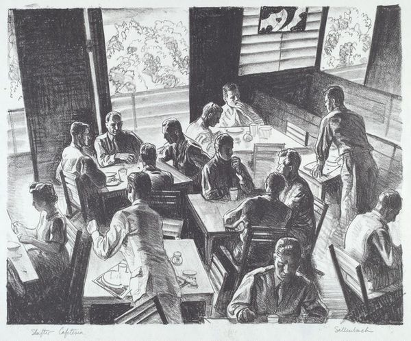 Editor: This is "New School Library," a graphite and pencil drawing, dating from around 1939 by Carlos Anderson. Looking at it, I’m immediately struck by how… distant it feels. Like peeking into a memory. The stark angles and muted tones give it such a removed, almost voyeuristic quality. What catches your eye when you look at this piece? Curator: Well, for starters, you're right about the distance. It's like we're hovering above the scene, which gives it a feeling of both observation and isolation. You feel *almost* invisible, don't you? Anderson really knew how to set a scene. Consider the way the light falls— those bright rectangles on the tables—punctuating the sea of students absorbed in study. It’s the kind of light that begs us to consider: what does 'knowledge' illuminate? Editor: That’s interesting…knowledge illuminating, because to me, it's shadowy and still, yet the bright desks invite you to reflect on the figures studying. Do you see anything specific connecting the artistic style and subject matter to the historical context, perhaps the social and intellectual climate of the late 1930s? Curator: Absolutely! Think about it – the 1930s, the Depression era, education becoming even *more* vital as a potential means of social mobility, and it’s right before the escalation into World War Two. And the style… it reminds me almost of a gritty movie still from the same era, like an early Film Noir… Do you notice any subtle anxiety there, any feeling that even knowledge has its limits? Editor: It does now that you point it out. Seeing the light, which represents "knowledge," with so much stark contrast actually illuminates the isolation and anxiety experienced in these trying times, because the knowledge almost becomes an alienating property. Curator: Exactly! Maybe Anderson saw that light of education offering salvation but also a strange detachment. Maybe art encourages seeing that life is an ungraspable dance of shadows *and* light! Thanks for those points, I'm off to consider my assumptions... Editor: A dance, indeed. That’s given me a new perspective. Thank you for this insightful observation!