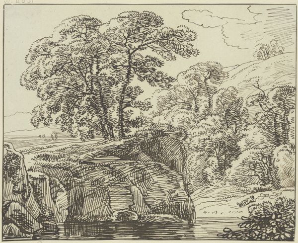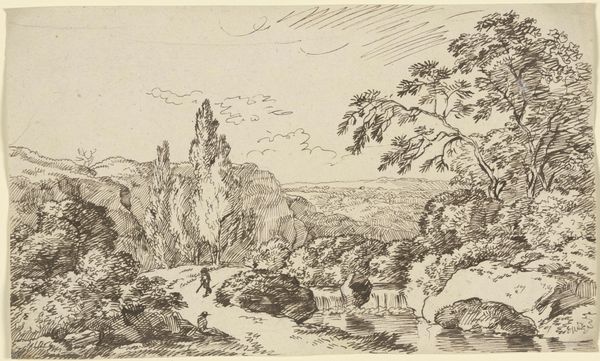 Franz Kobell created this landscape with staffage figures using etching. The scene presents a romanticized view of nature, a popular theme during the late 18th and early 19th centuries when the print was likely made. The image creates meaning through visual codes, like the sublime and imposing natural scene that dwarfs the small figures in the composition. This was a time when Germany was fragmented into many smaller states. There was growing interest in a unified German identity. Landscapes such as this can be viewed as a way to promote national pride and a shared cultural heritage. Institutions of art, like the Städel Museum where this print resides, played a role in shaping artistic taste. They were the gatekeepers of culture, influencing which artists and styles were valued. Understanding art requires research into the artist’s life, the cultural context, and the institutions that shaped its reception. By considering these factors, we can better appreciate the complex ways in which art reflects and shapes society.
