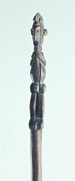 This wooden sculpture, titled "Figure," was created by an anonymous artist. It's fascinating to consider the cultural and social context from which this figure emerged. Without knowing the artist's identity or precise origins, we can still appreciate its potential significance within a specific community. The figure's stylized form, with its elongated limbs and emphasized genitalia, suggests a focus on fertility, power, or perhaps ancestral representation. We can explore the intersection of gender and representation embodied in the artwork. Is the emphasis on the figure's maleness a celebration of masculine strength, or does it speak to broader social structures where male identity is privileged? It also raises questions about how notions of beauty and the body are culturally constructed and communicated through art. As you reflect on this sculpture, consider how it challenges or reinforces societal norms, and the personal narratives that it evokes.