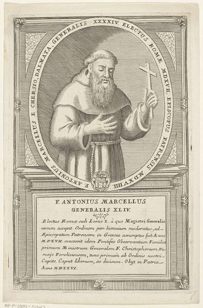 Curator: Let's consider this engraving, "Portret van Bernardino Prati," made between 1710 and 1738 by Antonio Luciani. As a materialist, I immediately think about the process. The engraver’s skill to transform a metal plate into this intricate portrait tells us about the labor involved. Editor: It's amazing the amount of detail achieved through engraving! What strikes me is the formal, almost severe, depiction of Prati. What do you see in this piece that maybe I'm missing? Curator: I am struck by the material choices. The lines created in the engraving form both the portrait and the lettering. In what ways did the artist navigate around and with these restraints? This piece wasn't made in a vacuum. Engravings like this one were often reproduced to disseminate information and ideas. Knowing that it depicts the 43rd Minister General of the Franciscan order tells us this was for more than personal satisfaction. Editor: So it's less about Prati as an individual and more about him as a figurehead, almost like a symbol? How did the use of a print influence who got to know about Prati? Curator: Precisely. The means of production dictate the accessibility. Engravings allowed for multiple copies to be made, furthering the reach of the Franciscan order’s influence and image. The work becomes a promotional piece. Did only the wealthy have access? How was this type of portrait viewed then versus now? Editor: I never considered the work in light of how many could view it, but seeing this work with labor and process, how accessible art truly was at one point, in comparison to now, gives me a whole new viewpoint on art and society in the 1700's. Curator: Considering art this way helps us see how intertwined art is with not just the wealthy but how materials themselves are tied to labor and influence society on many different levels.