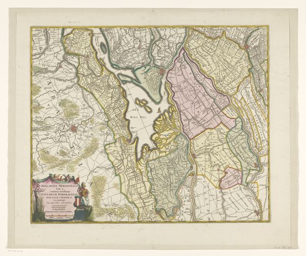 Curator: Here we have a 1709 etching by Abraham Allard entitled, "Kaart van Hengouwen met Bergen en omliggende steden", which translates to "Map of Hainaut with Bergen and surrounding cities." It depicts the region of Hainaut, now part of Belgium, in considerable detail. Editor: It's incredibly intricate! The formal qualities give the sense of organized chaos. The colours seem muted, giving the sense of something both ancient and strangely vital. The texture, though flat in the picture, implies incredible labour and process behind the carving. Curator: Indeed. This map offers insights into early 18th-century Dutch cartography and its reliance on etching. The precision used reflects not just the demands of the discipline, but of patronage as well. Patrons could wield symbolic influence through careful selection and control. This form of baroque visual rhetoric highlights societal and productive mechanisms that might escape those looking for artistic inspiration in something like painting alone. Editor: From a formal standpoint, observe the stark linearity used for roads versus the topographical differentiation shown by the etching itself. See how Allard manages to represent urban density with little clusters versus forests through similar repetitive shapes. It creates an all-over patterned feel which serves an immediate purpose as information, but then subliminally affects the aesthetic of the image too. Curator: Maps like these weren't just about geography; they were also instruments of power. Possession of the detailed knowledge that maps provided gave ruling powers very real capabilities. Look closely at how specific urban areas or geographic entities are delineated, reflecting strategic or proprietary interests. It wasn't just aesthetic choices, but also displays of geopolitical assertion in material form. Editor: Agreed! There's this incredible dialogue created between abstract sign and recognizable land that's also visible with any formal landscape painting. To me, Allard successfully captured not only a physical space, but also that elusive character of place we all intrinsically recognize and feel but that resists definition. Curator: Precisely. In analyzing the etcher's work and intention in a map like this, we better see how such works can affect public perception and facilitate control within and among the various burgeoning nations of this era. Editor: Absolutely, seeing the intentional aesthetic language applied, whether of utility or pure form, allows for insight and greater aesthetic fulfillment in itself!