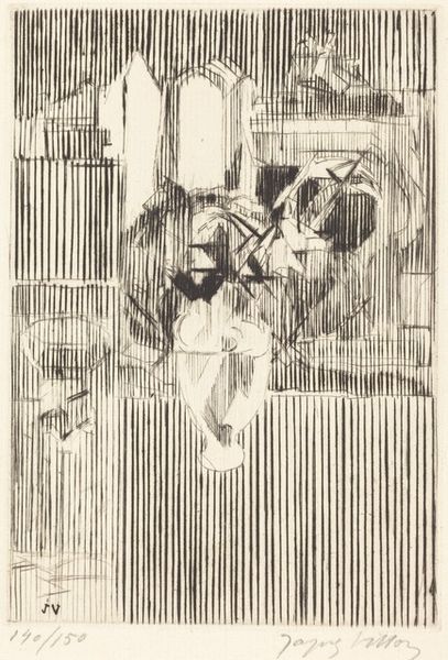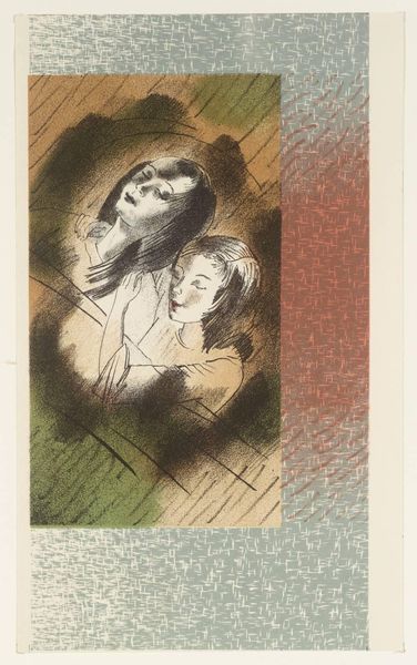 Curator: Oh, this makes me think of a half-remembered dream, all soft edges and muted tones. It’s charming. Editor: This is an untitled print by Barnett Freedman, a British artist born in 1901. It’s part of the Tate collection and showcases Freedman's distinctive approach to lithography. Curator: Lithography, yes, you can really see those layers. The couple looks like they’re caught mid-dance, or maybe a theatrical performance? There’s a staged quality to it. Editor: Freedman was known for his work in commercial art and design, alongside these more personal pieces. He often depicted scenes of everyday life, elevated through his artistic style and the printing process. Curator: There’s a sweetness in the man’s gaze, isn't there? But something about the angularity prevents it from being sentimental. And the framing around them feels almost like a proscenium arch. Editor: It reflects a broader interest in capturing the spirit of British life between the wars. Freedman's work, technically innovative, helped democratize art by making it more accessible. Curator: It has an almost ghostly beauty to it. A gentle reminder of moments, both real and imagined. Editor: Yes, and to me it captures a very specific time, and shows us the power that printmaking held in British society.