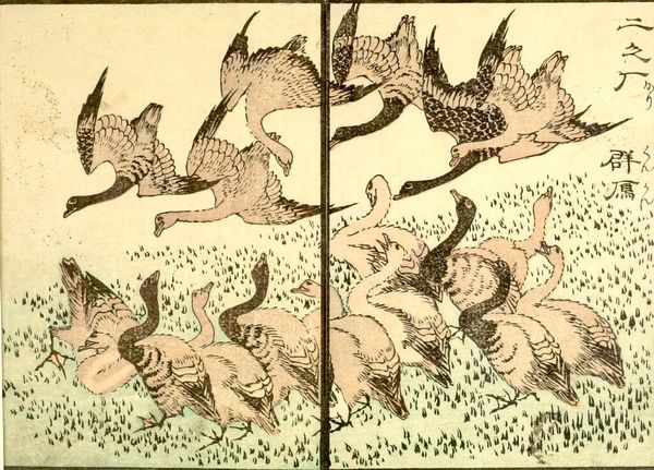Curator: Here we have a diptych from the illustrated book "Kacho Gaden" by Katsushika Taito II, currently residing in the Harvard Art Museums. Editor: What strikes me is the simplicity of the print's palette, yet it beautifully evokes the cool rush of water and a sense of tranquility. Curator: Indeed. Waterfowl motifs in Japanese art often represent marital harmony and fidelity. The mandarin duck, particularly, is a symbol of conjugal affection. Editor: The texture created by the woodblock printing process is quite evident. I'm curious about the specific carving and printing techniques used to achieve such detail. Curator: Precisely. The symbolism and the artistry are intertwined. The visual language of the birds speaks to cultural values. Editor: Examining the materiality and labor helps us understand the broader context of artistic production in this era. Curator: Looking at it through the lens of cultural memory and visual codes allows us to deepen our understanding. Editor: It’s a testament to the enduring power of both material processes and symbolic representation.