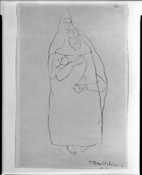 Editor: Here we have François Marius Granet’s drawing, Monk. It's quite small, only about 16 by 10 centimeters, but the figure feels monumental within the space. What do you see in the composition of this piece? Curator: I am struck by the stark contrast between the delicate lines defining the monk and the suggestive, almost chaotic, shading around his form. Notice how the upward gaze and outstretched hands create a powerful vertical thrust, countered by the implied recession of the steps. Do you find the figure's placement balanced, or does it lean towards asymmetry? Editor: It definitely feels asymmetrical, which creates a sense of unease, despite the apparent simplicity. I appreciate your perspective! Curator: Indeed. The tension established by the contrasting elements and off-center placement contributes significantly to the work's dynamic quality. I find that fascinating.
