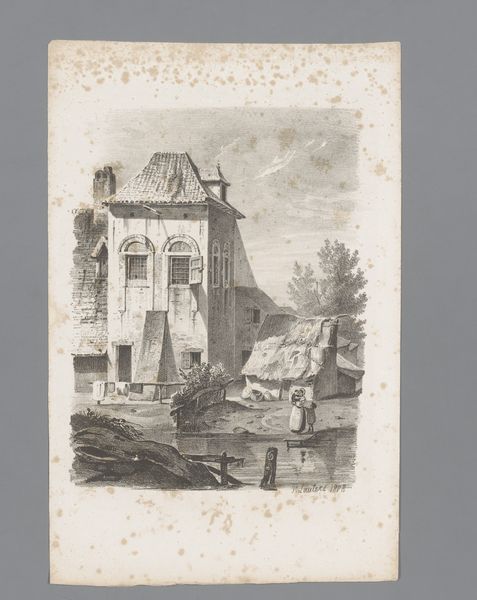 This print was made by Alexander Ver Huell, and it presents a woman and children playing with puppies. The print was made through etching, a process where lines are incised into a metal plate with acid, then filled with ink and pressed onto paper. The artist has focused attention on the contrast between the crisp details of the foreground figures and the crumbling facade of the building behind, rendered in the same linear style. The etched line has an inherent austerity, and the image gives a sense of everyday life and a kind of candid naturalism. The medium of the print is significant. It's easily reproducible and a relatively affordable process. This brings the scenes of everyday life depicted to a wider audience, beyond the elite circles typically associated with art patronage, and offers a glimpse into the lives of ordinary people.