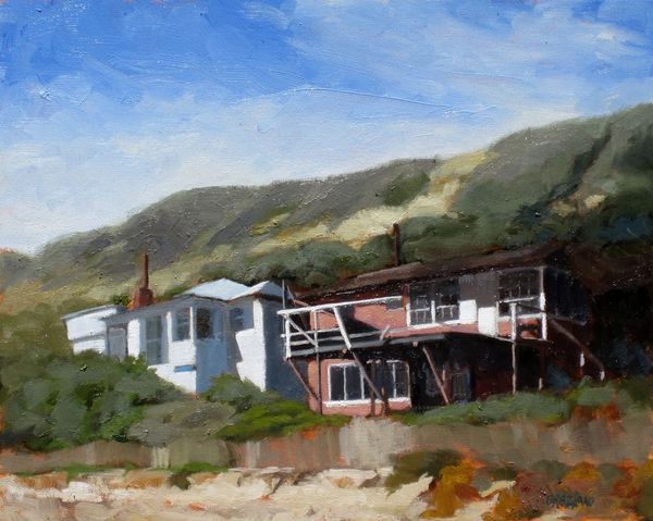 Dan Graziano’s “Cove Cottages” presents a tableau of domesticity nestled within nature, evoking a sense of refuge and isolation. The cottages, perched along the hillside, remind us of humanity’s eternal quest for sanctuary. Consider the humble cottage itself, a motif resonating across centuries. From medieval hovels to idealized pastoral scenes, it appears as a symbol of simplicity, escape, and connection to the earth. One can trace its evolution from a place of mere shelter to a locus of romantic longing. As it appears in Van Gogh's works, the cottage embodies both the beauty and the harsh realities of rural existence. Here, Graziano captures this enduring symbol, layering it with a contemporary sensibility. The bold strokes and vibrant colors speak to the psychological weight of ‘home,’ stirring subconscious memories. The cottages become a vessel for projecting our desires, anxieties, and nostalgic yearnings. The motif of the cottage reveals itself as a cyclical phenomenon, ever-present, resurfacing in various forms and continually colored by the emotional and cultural landscapes it inhabits.