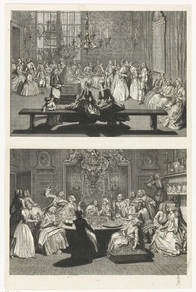 Curator: This print, created by Bernard Picart in 1722, is titled "Communie/ Laatste communie" or "Communion/ Last Communion." It resides here at the Rijksmuseum. Editor: The contrast immediately grabs you. The composition feels a bit stiff, perhaps a consequence of the engraving process itself? It's fascinating how the artist manages to convey such a somber mood within that formal structure. Curator: Absolutely. The two scenes, divided horizontally, are both rife with symbolism. The upper panel illustrates the sacrament of communion, a communal ritual of faith. Editor: And look at the textures—the heavy drapery, the polished floors—everything speaks to a specific economic class and access to material resources during the baroque era. How was Picart connected to that system? Curator: Good question! The work clearly resonates with baroque aesthetics, even as we consider how printmaking made such scenes accessible to wider audiences than painted canvases might. Note the contrast: One panel depicts communion within the presumed safety and sanctity of the church, while the lower presents the last rites administered at a deathbed. Editor: Interesting. So the *making* of this print—engraving, materials, production—mirrors a shift toward accessibility but it’s also still operating inside certain parameters of power. It’s for consumption, but within what social strata? Curator: The imagery is dense with theological implications. The holy Eucharist is central to Catholic faith; a symbolic participation in the sacrifice of Christ, whereas the lower scene features the "viaticum", literally "provision for the way"—referring to the last rites administered before death, offering solace, forgiveness, and passage into the afterlife. Both suggest transformation through ritual, the earthly merging with the divine. Editor: Yes, this speaks to material constraints again, where even the most profound, transformative, "spiritual" experiences are framed, bound, shaped through physical space, objects, cloth, gestures... Do you know for what audience Picart specifically made the prints? Curator: Well, it served devotional functions obviously and it would remind congregants, no matter their status in life, of their collective membership in this holy community. Editor: Food for thought! Examining this image has reinforced how deeply intertwined spirituality and materiality really are, and to see a moment like that represented so carefully... Curator: ...I appreciate how the artist managed to compress weighty concepts of faith, death, and redemption within such ordered frames, capturing fleeting moments of grace.