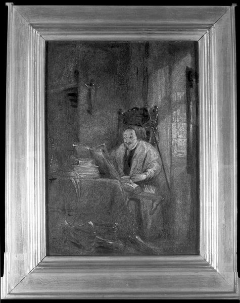 Editor: So, here we have Tony Offermans' "The Cooper's Shop," a monochrome painting from the late 19th or early 20th century, depicting a craftsman in his workshop. I find the scene quite serene, almost dreamlike in its simplicity. What do you see in this piece? Curator: It's a quiet observation, isn't it? I'm drawn to the way Offermans captures the light filtering through the window, illuminating the cooper's focused labor. The tools and half-finished barrels tell a story of craft, tradition, and the dignity of manual work. It also makes me wonder, what did this cooper's world smell like? Editor: That's a great question. I hadn't considered that. Curator: Wood shavings, maybe a hint of the spirits those barrels would eventually hold… Editor: Well, now I’m thinking about the stories these barrels could tell and how painting captures fleeting moments. Curator: Exactly. It’s a window into another time, isn't it?