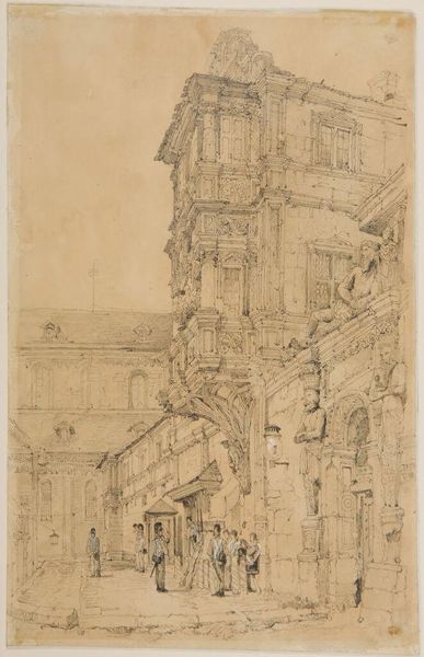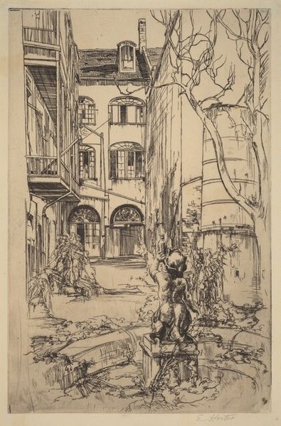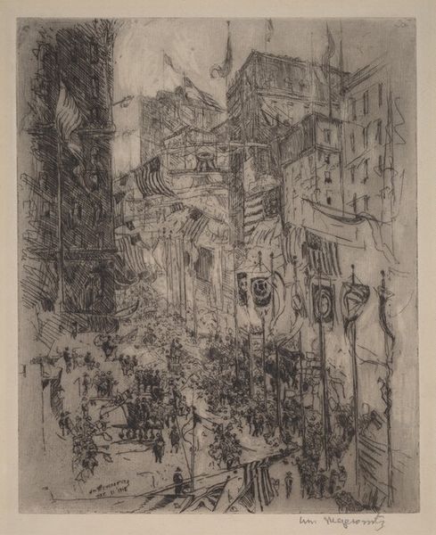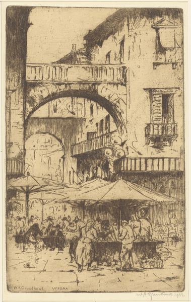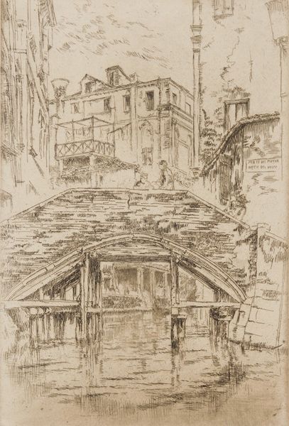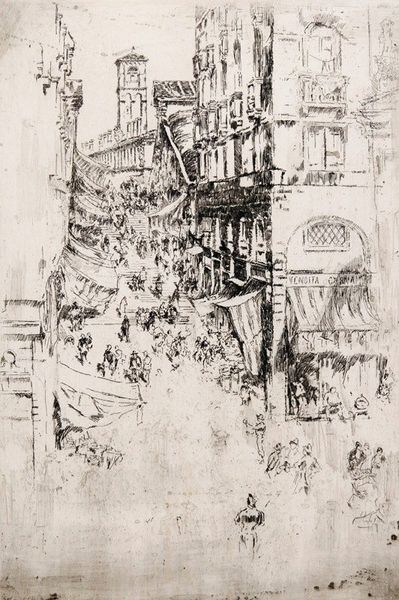 Editor: This is James Abbott McNeill Whistler's etching, "The Rialto," at the Harvard Art Museums. It feels so alive with the hustle and bustle of Venice. What do you see in this piece? Curator: The image vibrates with a specific cultural memory. Notice how Whistler uses the Rialto as a stage. Do you observe how the figures become almost archetypal, their forms less important than their implied actions? Editor: I see that. It’s like they’re carriers of Venetian life, not just individuals. Curator: Exactly. The Rialto wasn’t just a location; it symbolized Venice's commercial power, its global reach. Whistler captures not just a place, but a feeling. Editor: That makes me see it differently – as a symbol within a symbol.