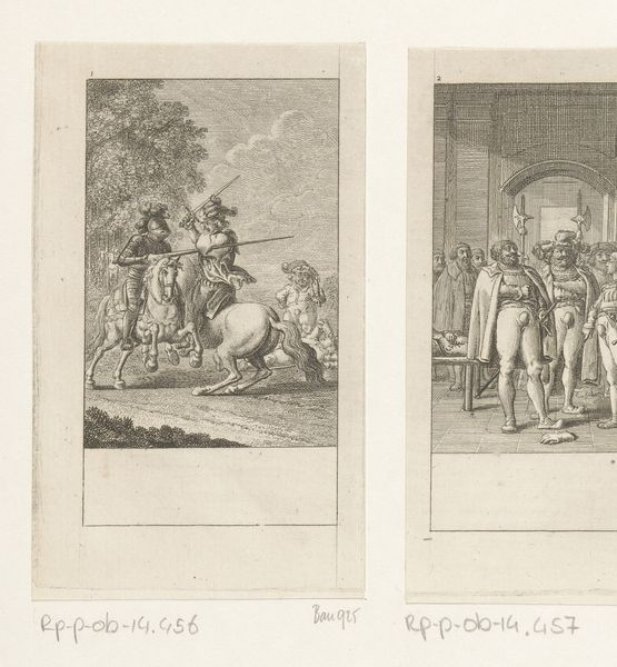 Daniel Nikolaus Chodowiecki made this print, Nikanor brengt het bericht over de verbanning van Coriolanus, in the 18th century. The image depicts a scene from Roman history, focusing on the moment Coriolanus learns of his banishment. Prints like these served a crucial role in disseminating knowledge and shaping public opinion during the Enlightenment. Chodowiecki’s work reflects the era's fascination with classical antiquity and its use of historical narratives to comment on contemporary social and political issues. Germany in the 1700s was seeing a rise in national consciousness and a turn towards art with moral and educational purposes. The print would have been relatively affordable, making it accessible to a broad audience. By examining the print's visual style, subject matter, and distribution, we can gain insight into the cultural values and intellectual currents of the time. Researching the print's production, reception, and circulation can reveal its role in shaping public discourse. The meaning of this image is contingent on this social and institutional context.